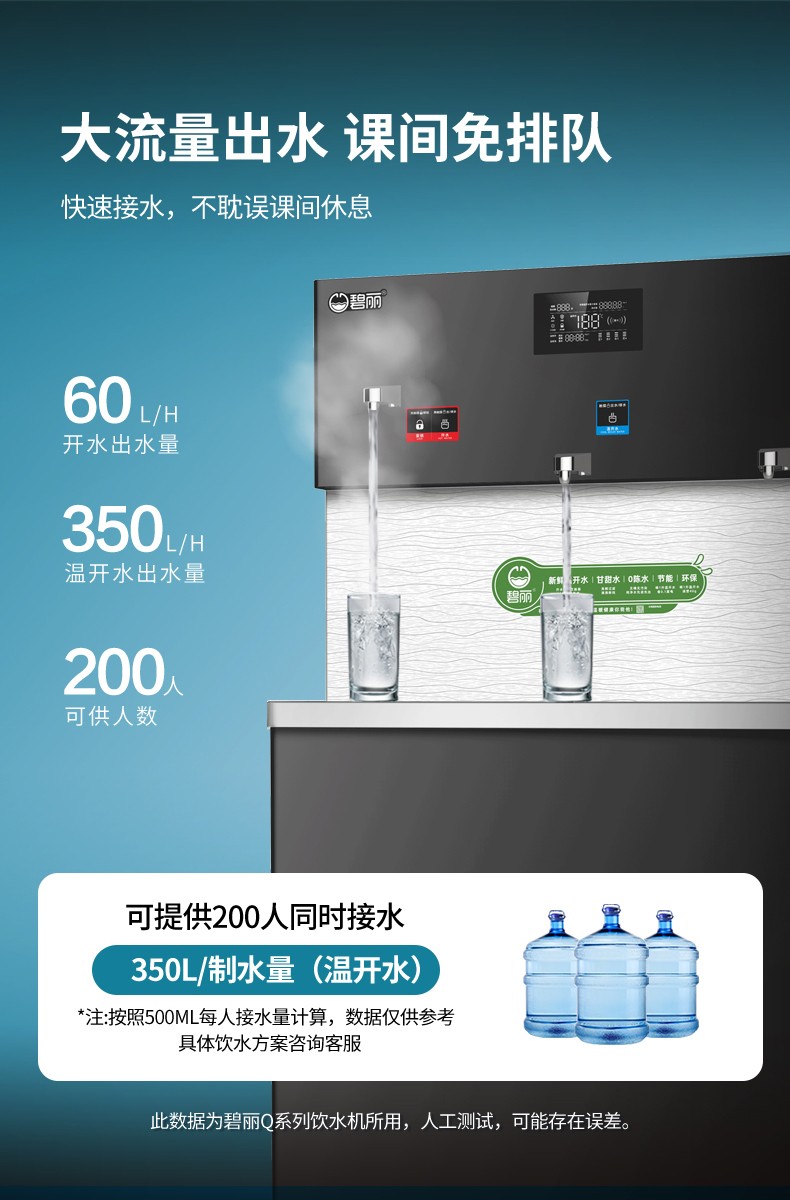 从获悉用户需求,前期调研,到跟进设备管道设置及安装,碧丽的工作人员全程跟进,工作一丝不苟,当前往梅州市公安局交通警察支队兴宁考场的市民喝上了健康、安全有保障的碧丽温开水时,是对我们全体碧丽人大的褒奖!在获悉梅州市公安局交通警察支队兴宁考场的饮水需求后,我司的饮水专员迅速跟进,针对其实际情况提供了好的饮水解决方案:碧丽管线机搭配碧丽商用反渗透净水机。这个方案的优势有很多,碧丽管线机小巧玲珑,安装所需位置小,通过碧丽商用反渗透净水机过滤后的水水质甘甜可口,开水、温水两大选择,充分满足用户需求。碧丽商用反渗透净水机,一体机设计,模块组合,安装简单,占地空间小。设备采用超静音设计,制水噪音少于50分贝,LED显示屏还能够显示设备的运行状态,科技感满满的。很多消费者对温开水存在疑虑,认为其是未煮开且单纯加温到相应温度的水。然而,碧丽直饮水设备提供的温开水是100%煮开后再降温到适宜温度,出水水质有保障还能养护肠胃,35℃~40℃的温水,是人体胃肠的“好朋友”。碧丽,中国公共饮水行业开创企业,20年行业积淀,拥有行业全的产品线,产品种类多、性能强,大型标杆工程遍布全国各地!碧丽,温开水饮水机研发企业,并致力于推广温开水的健康性,一心为全人类的饮水健康做奉献。碧丽贴心服务+细致用心=专注!欢迎拨打碧丽全国客服热线:400-800-0725,我们将竭力为您提供优的饮水方案,为健康饮水生活加分!